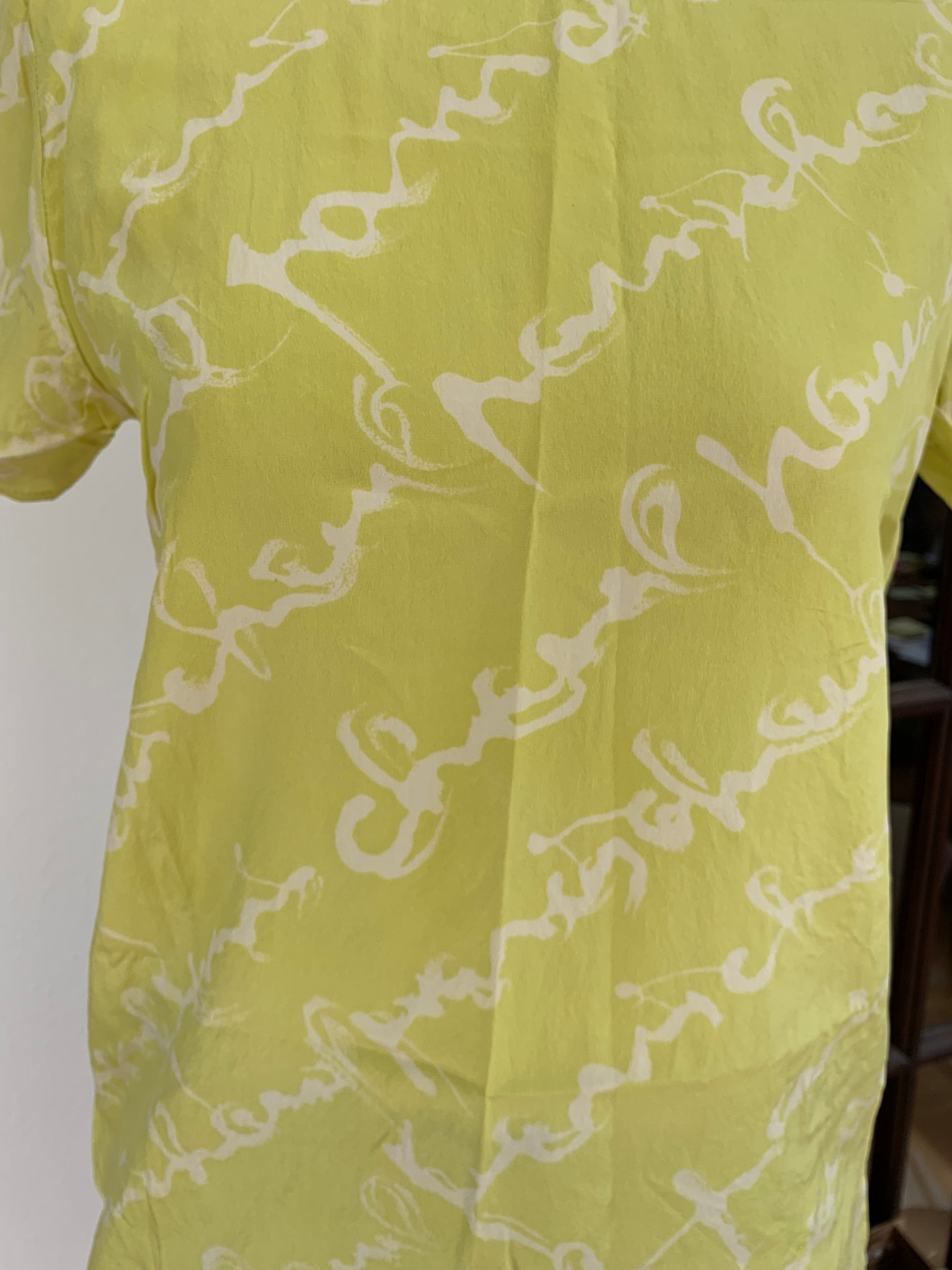 RARE Vintage CHANEL CC Logo Monogram Lime Green White Graffiti Short Sleeve Dress Tunic Button down A-Line Crop Cover Up Silk